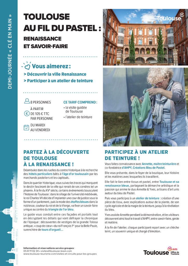 Enfin sachez que l’Office de Tourisme propose, en partenariat avec Ahpy Bleu de pastel, une expérience d’une demi-journée combinant voyage à la Renaissance et atelier de teinture appelée « Toulouse au fil du pastel ».